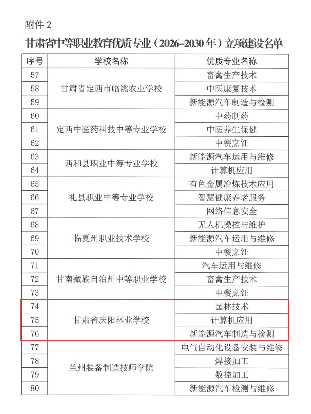 近日,甘肃省教育厅、甘肃省人力资源和社会保障厅联合印发《关于公布甘肃省优质中等职业学校和优质专业(2026-2030年)立项建设单位的通知》,甘肃省庆阳林业学校凭借扎实的办学根基、鲜明的专业特色和突出的育人成效,成功获评省级优质中等职业学校建设单位,园林技术、计算机应用、新能源汽车制造与检测三大专业同步入选省级优质专业建设名单,实现“学校+专业”双丰收,标志着学校职业教育高质量发展迈入提质增效的崭新阶段。