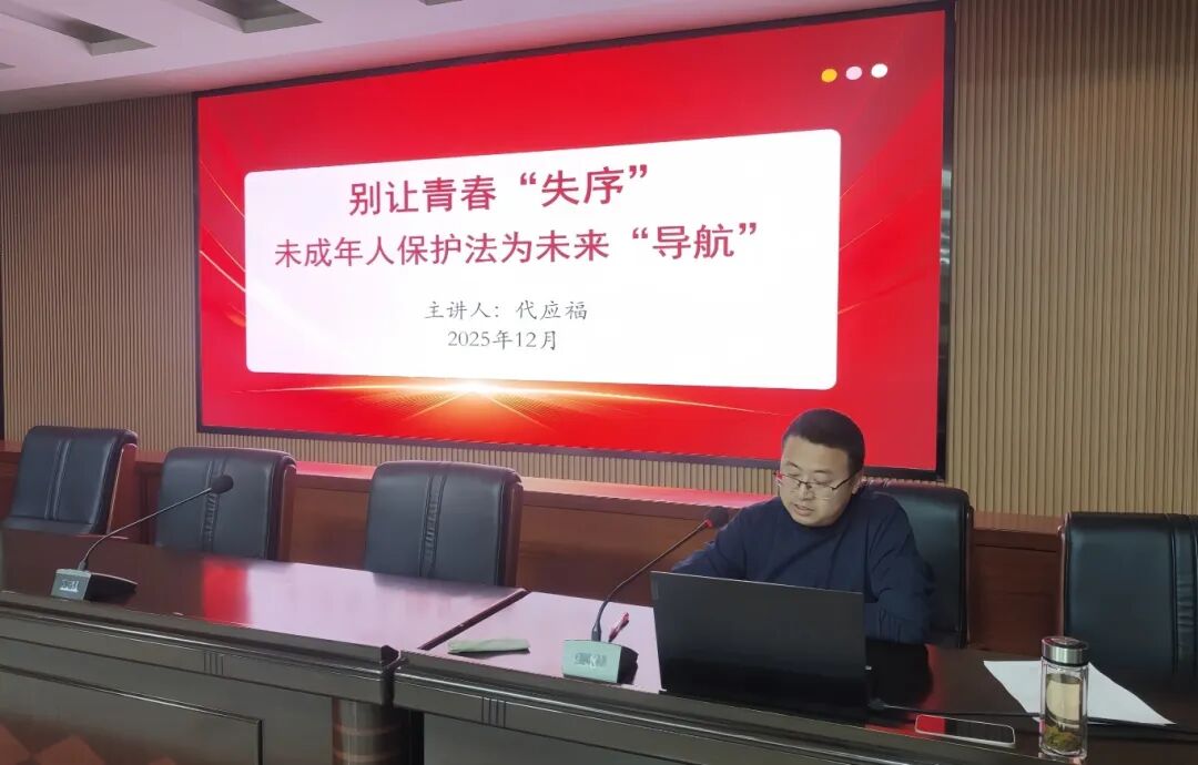 为持续深化党的二十届四中全会精神学习贯彻,构建“理论学习-价值引领- 实践赋能”的递进式育人体系,继前两期团课聚焦全会初探、中国制度优势解读之后,2025年12月9日晚,“深入学习二十届四中全会精神”主题系列团课第三讲在综合楼报告厅举行。我校思政骨干教师代应福以“别让青春‘失序’—未成年人保护法为未来‘导航’”为题,为全校200余名学生干部、团员代表带来一堂深入浅出、启思导行的法治教育课。