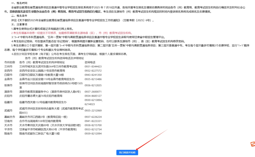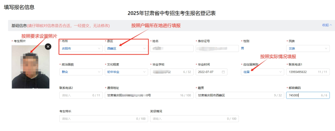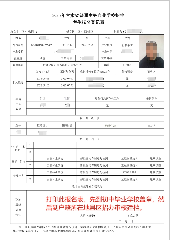 所有在甘肃省国家教育考试综合管理平台考生服务平台(https://kw.ganseea.cn/login)填报我校的考生,网上报名结束后,考生本人须持报名时打印并完成思想政治鉴定的《报名登记表》、身份证、户口簿、毕业证原件及中考成绩单到考生户籍所在县(区)招办进行现场资格审核和信息确认,否则志愿填报无效。被录取的考生,正式开学报到时,将档案交班主任处。